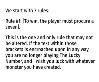 Welcome to The Lucky Number! This is a game about rules and winning,* inspired by the game Nomic, The Rule Book: The Building Blocks of Games, "Does Super Mario Bros. (1985) Have Rules?" by Jay Dragon, and the Ship of Theseus.